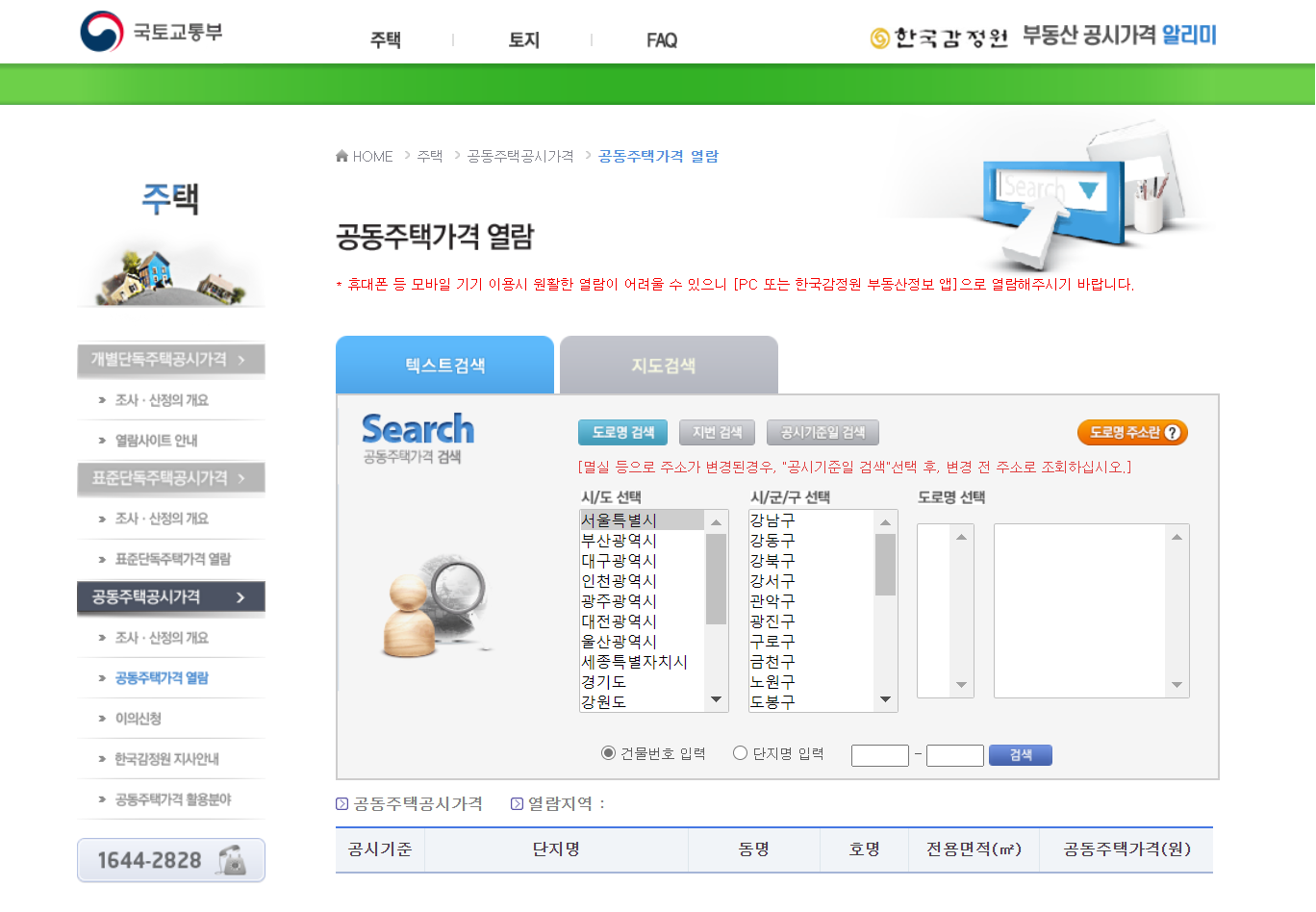 3. 지역 선택 후 공동주택 공시가격 확인하기