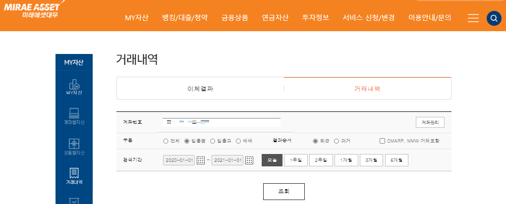 <MY자산> - <거래내역> - 입출금 항목 선택하고 검색기간을 입력한 뒤 조회버튼을 눌러주세요.