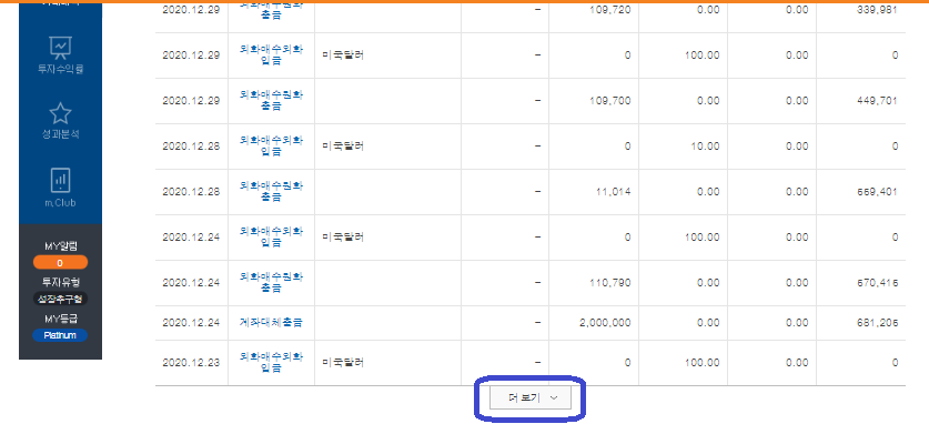 거래내역이 많다면, 아래 <더보기> 버튼이 보일거예요. 놓치지 말고 눌러 눌러주세요.