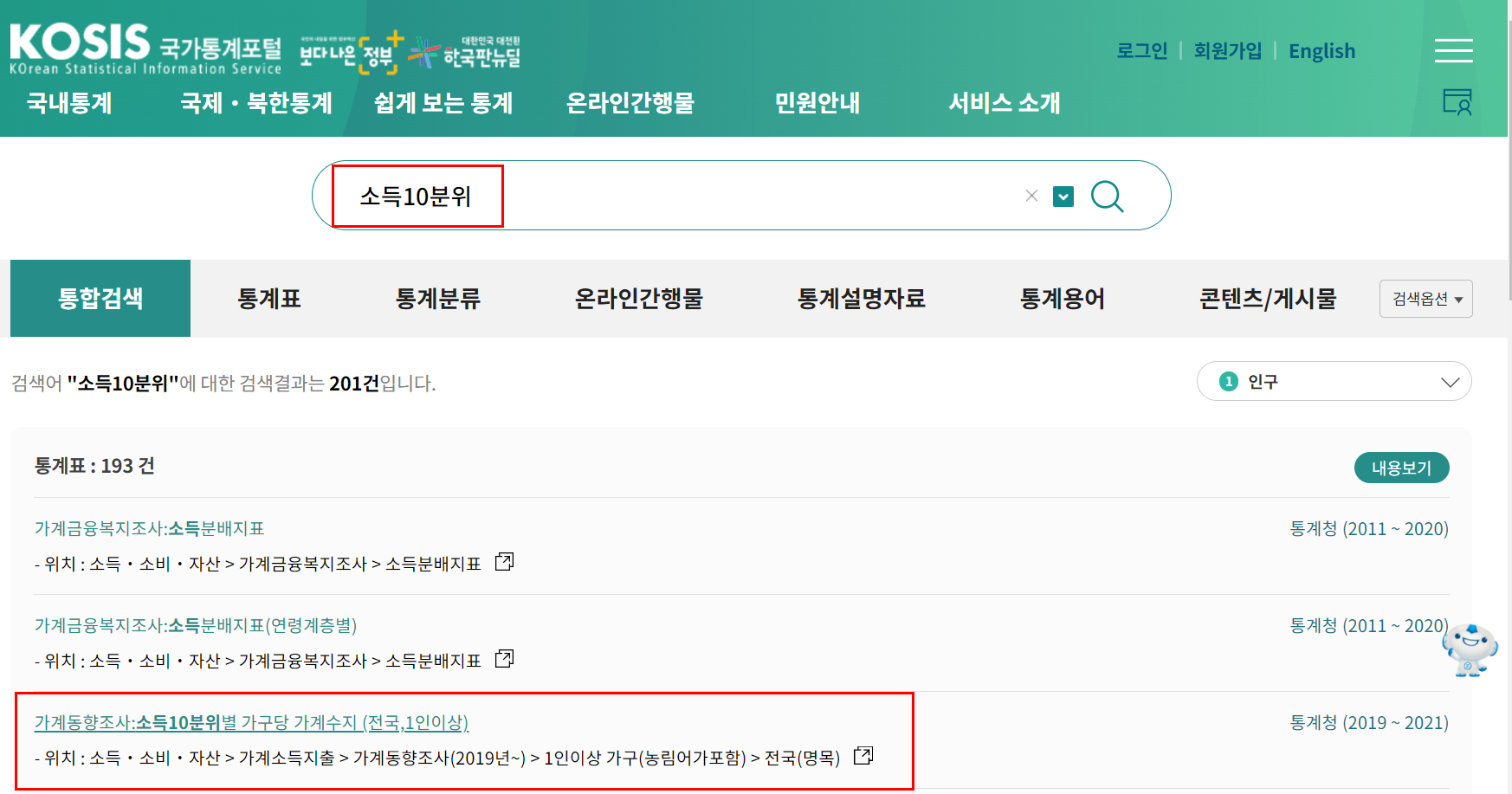 통계청 홈페이지에 접속해서, 소득 10분위를 확인해보자.
