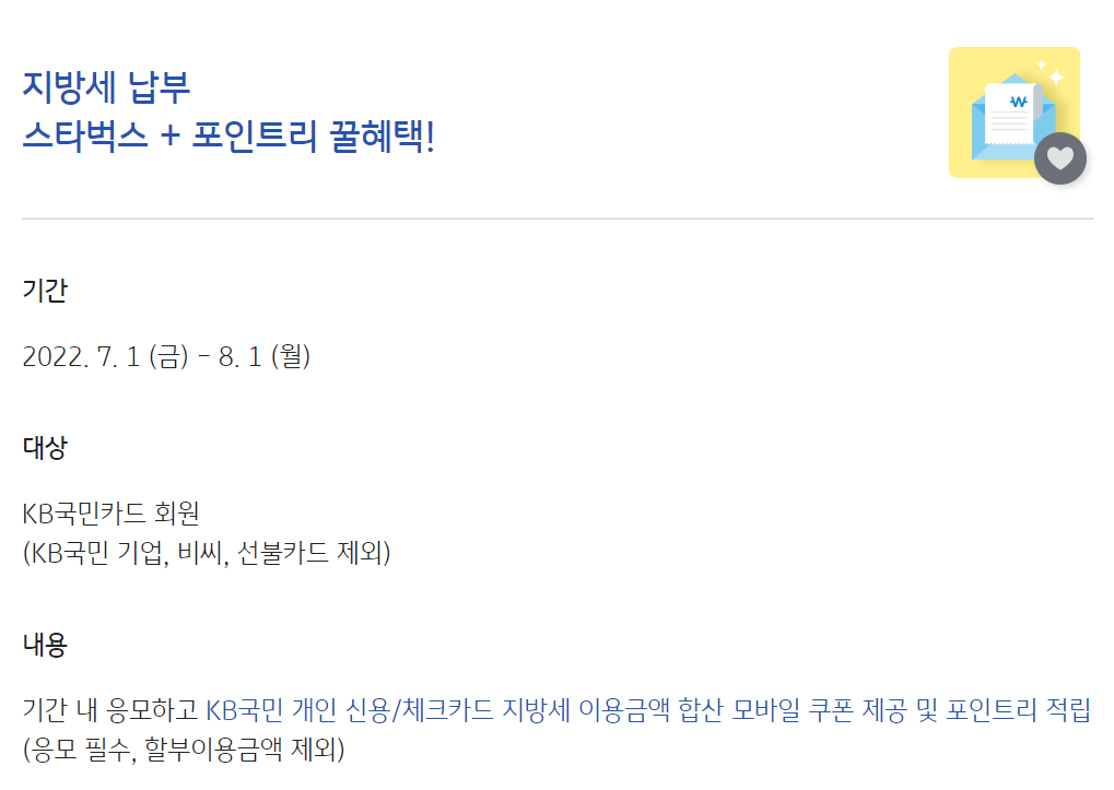 지방세 납부스타벅스 + 포인트리 꿀혜택! 기간 2022. 7. 1 (금) - 8. 1 (월) 대상 KB국민카드 회원 (KB국민 기업, 비씨, 선불카드 제외) 내용 기간 내 응모하고 KB국민 개인 신용/체크카드 지방세 이용금