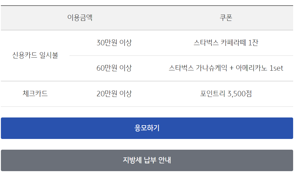 | 국세,지방세 50만원 이상 결제하고 응모하기 클릭하면 스타벅스 아메리카도(tall) 2매 증정 |